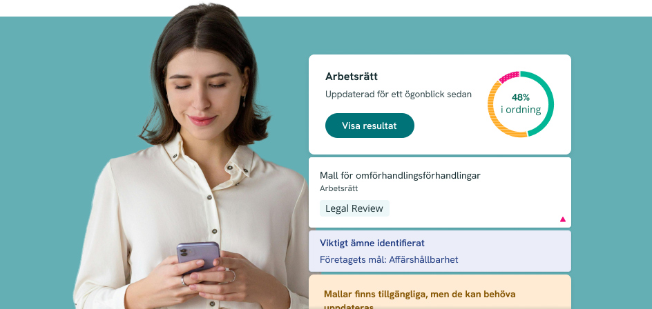 Få en tydlig, transparent och heltäckande överblick och kontroll över ditt företags juridiska frågor som stöd för din verksamhet. Identifiera och hantera juridiska risker i tid och säkerställ affärskontinuitet i en föränderlig miljö. Vår centraliserade tjänst sparar tid och ger dig tryggheten i att juridiska frågor hanteras professionellt och i ordning – säkert och tydligt.